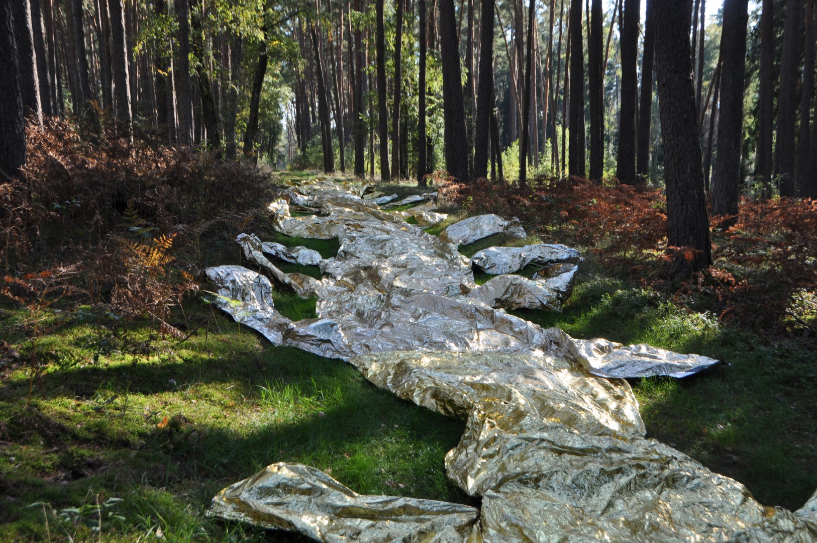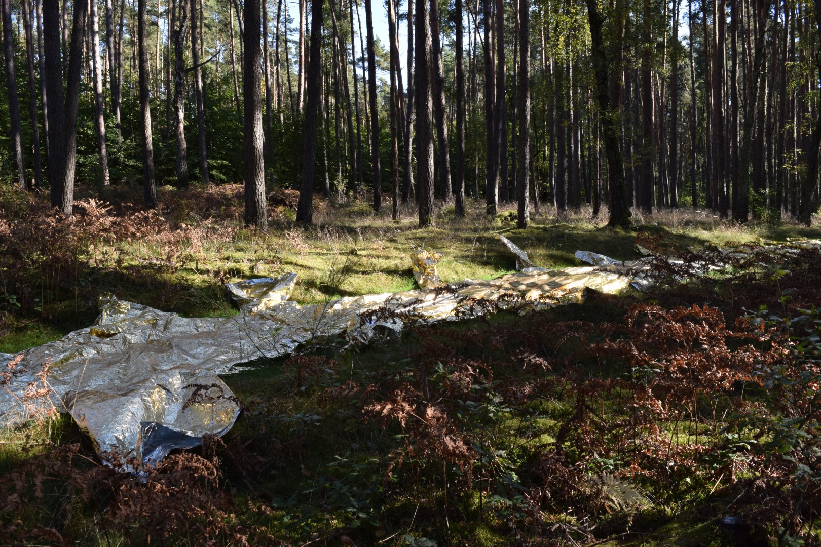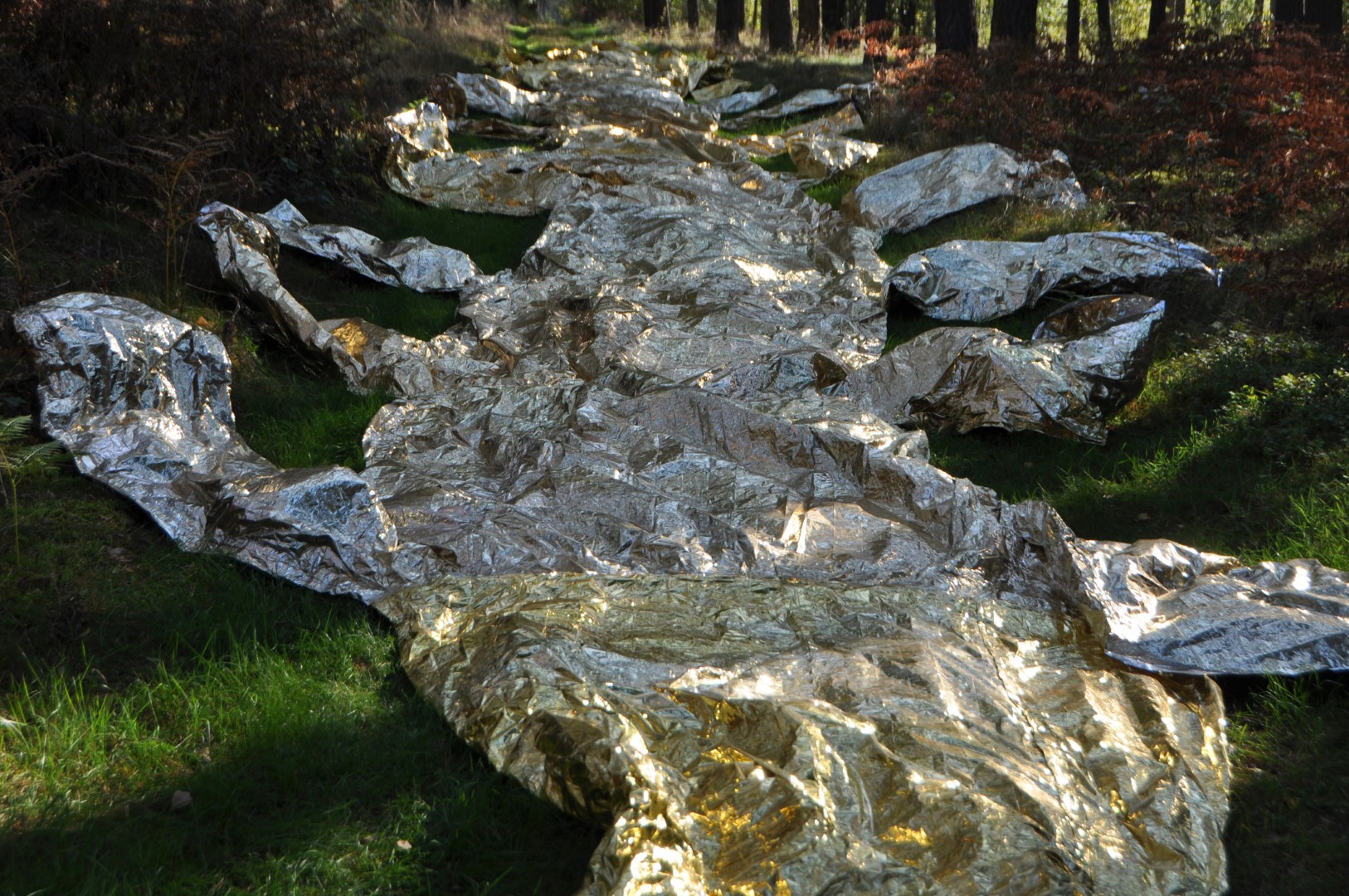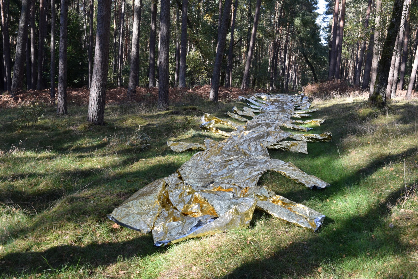 The use of rescue blankets refers to the aesthetic strategies of Ai Weiwei and the Arte Povera movement.